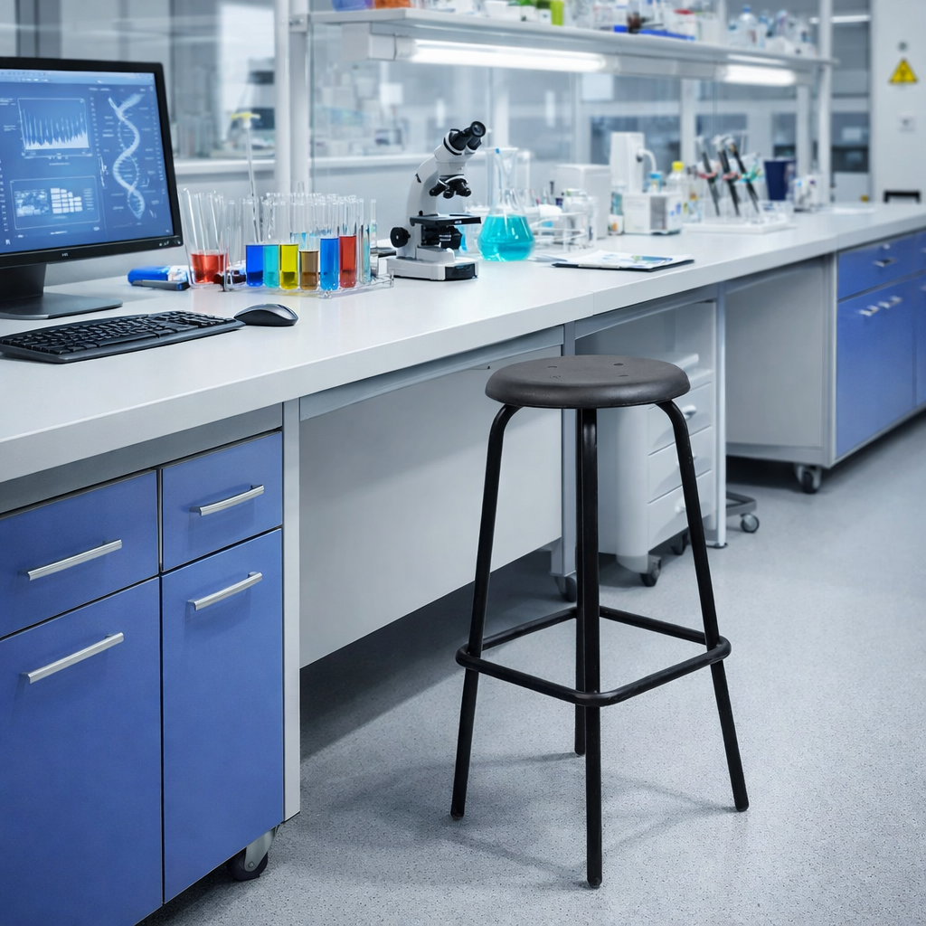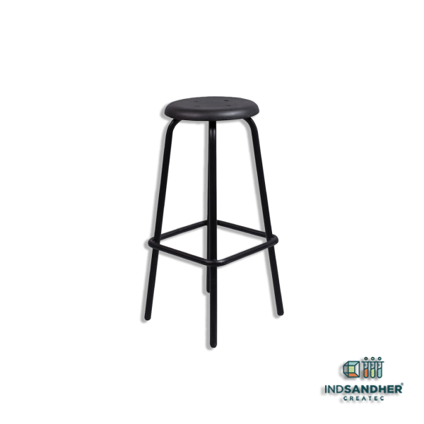 Banco metálico para laboratorio escolar, con asiento de polipropileno en color variable.